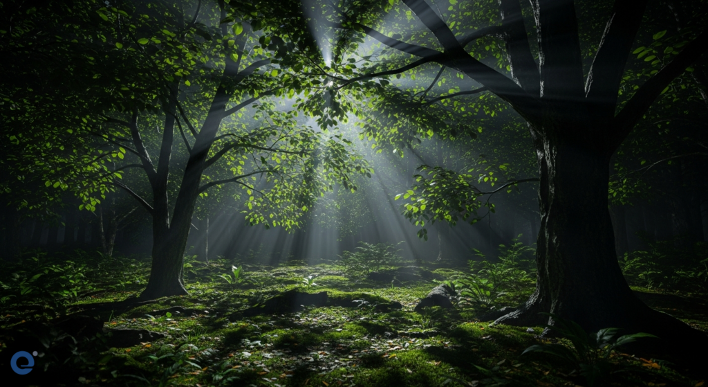 Một khu rừng đêm lung linh với ánh trăng xuyên qua tán lá, tạo nên những vệt sáng và bóng đổ huyền ảo trên mặt đất.