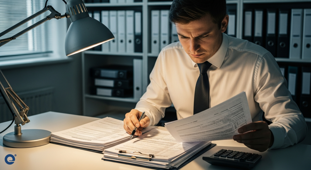 Nhân viên đang cẩn thận xem xét bảng lương và các chứng từ liên quan, thể hiện sự quan tâm đến nghĩa vụ thuế của công ty.