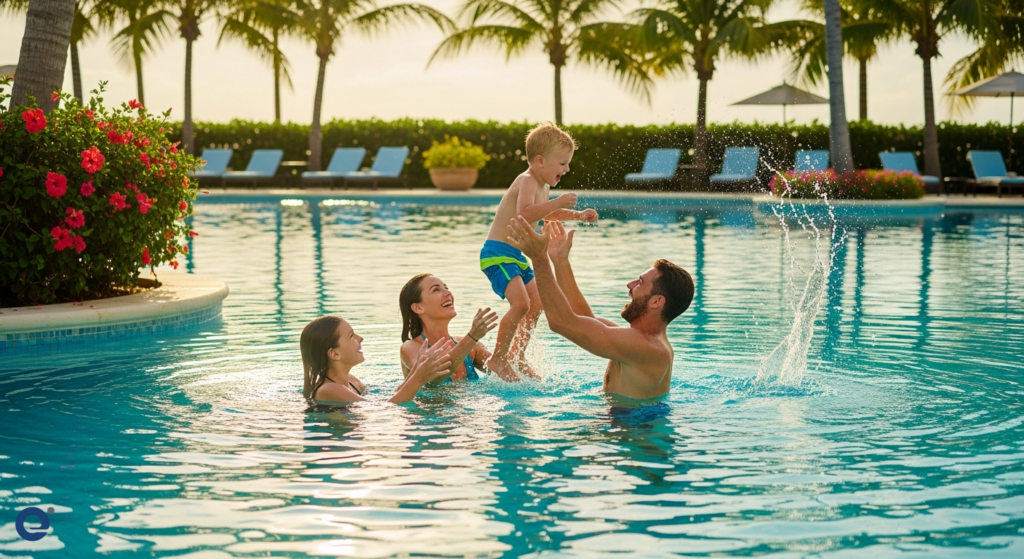 Một gia đình vui vẻ tận hưởng kỳ nghỉ dưỡng tại resort, biểu tượng cho các phúc lợi giải trí mà doanh nghiệp có thể cung cấp.