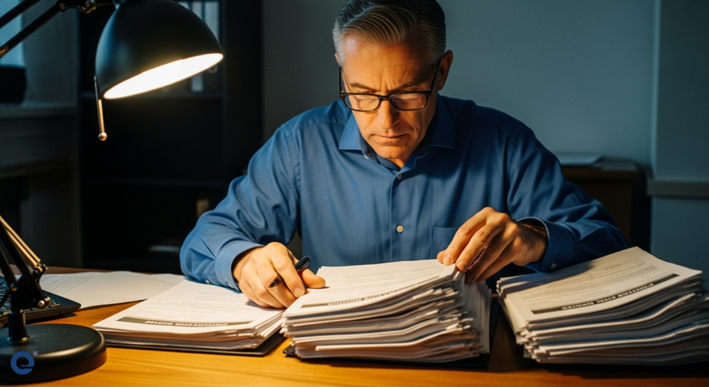 Một người quản lý đang cẩn thận sắp xếp các tập tài liệu chứng từ trả hàng, chuẩn bị cho việc quyết toán thuế.