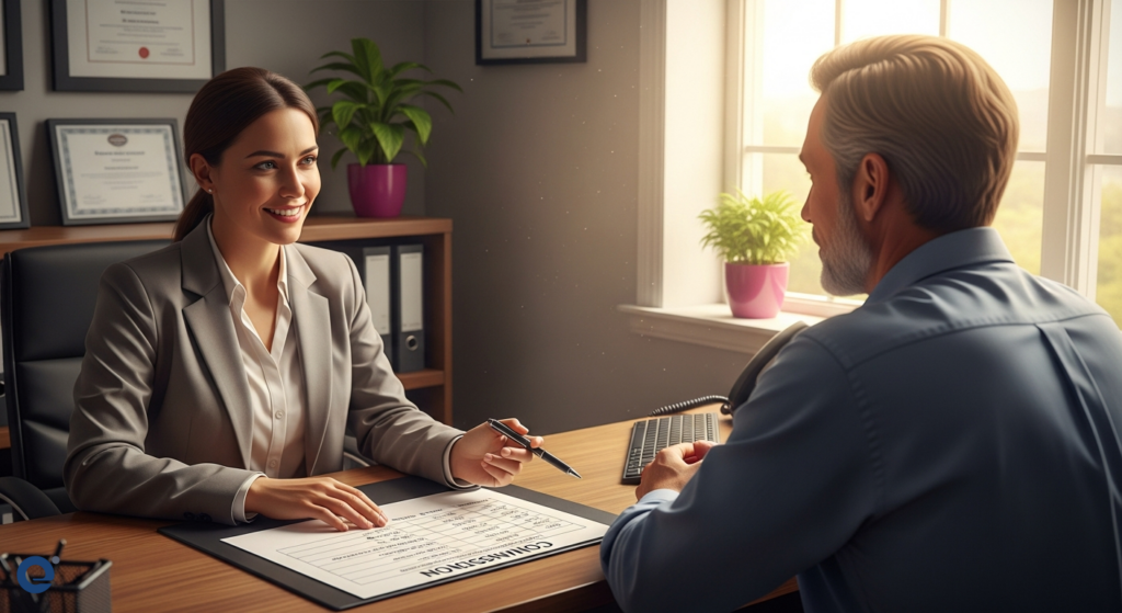 Một đại lý bảo hiểm đang tư vấn cho khách hàng, bên cạnh là bảng tính hoa hồng.