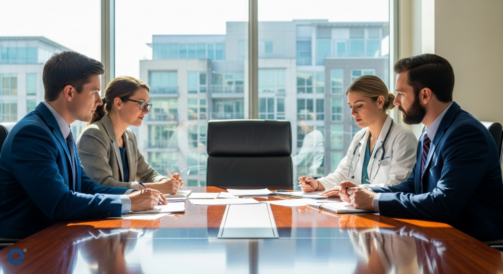 Một nhóm giáo viên và bác sĩ đang thảo luận về các chính sách hỗ trợ doanh nghiệp trong lĩnh vực xã hội hóa.