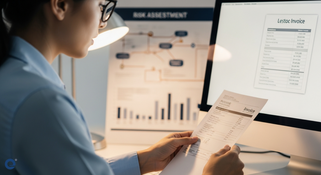 Nhân viên kế toán đang kiểm tra kỹ lưỡng một hóa đơn điện tử trên màn hình máy tính, với biểu đồ rủi ro hiển thị phía sau.