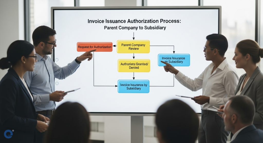 Ví dụ, nếu công ty con A phát hành hóa đơn cho công ty mẹ B, hóa đơn sẽ ghi thông tin của B là người mua. Thông tin của A là người bán, nhưng có thể có ghi chú “Được ủy quyền phát hành bởi Công ty mẹ X”.