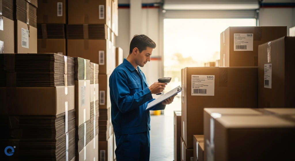 Một nhân viên kho đang cẩn thận kiểm kê các thùng hàng, đảm bảo số liệu khớp với hệ thống.