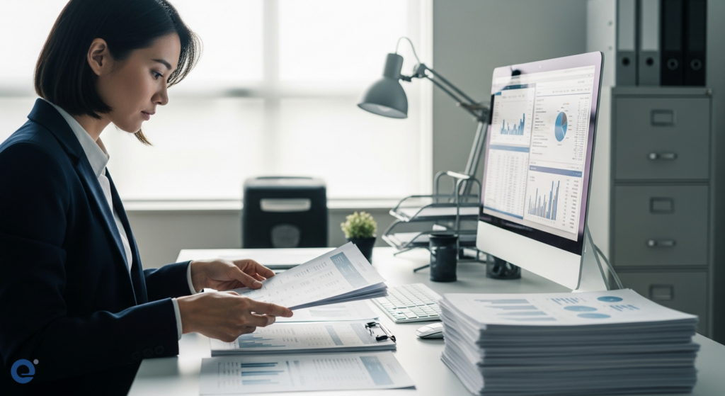Hình ảnh minh họa một người đang cẩn thận sắp xếp các tài liệu giấy tờ và kiểm tra dữ liệu trên máy tính, thể hiện sự chú trọng vào việc bảo mật thông tin kinh doanh và thuế.