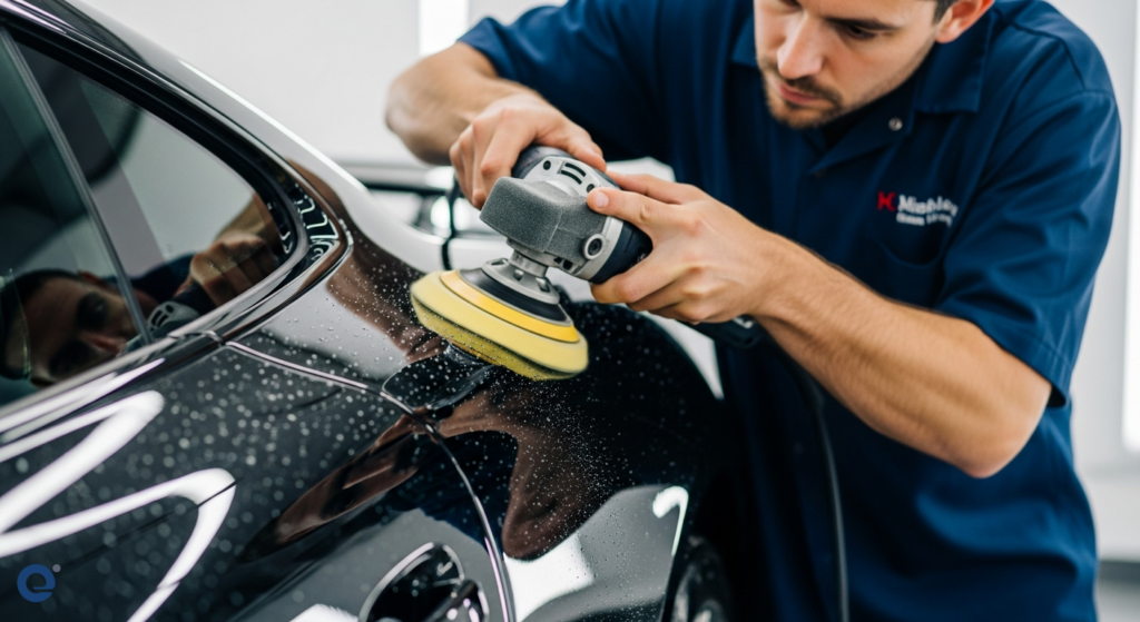 Một thợ detailing xe đang tỉ mỉ làm sạch và phục hồi lớp sơn xe, thể hiện sự chuyên nghiệp và chú trọng đến từng chi tiết.