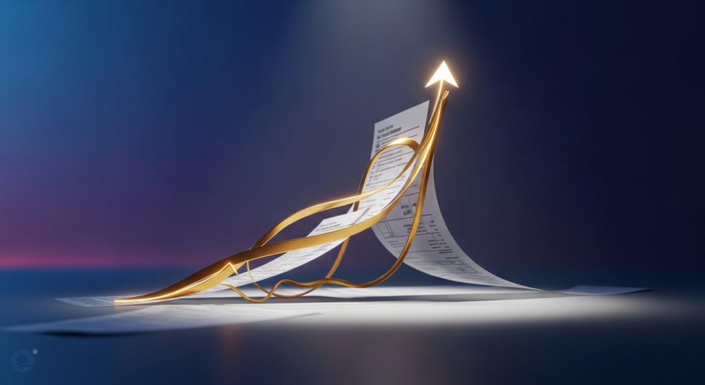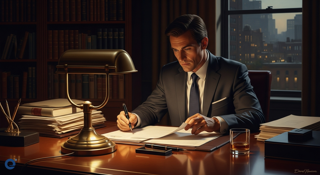 Minh họa một người đàn ông lịch lãm đang xem xét các tài liệu tài chính dưới ánh đèn bàn ấm áp.