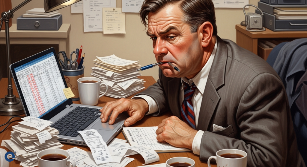 Một nhà phân phối MLM đang xem xét cẩn thận các khoản thu nhập và chi phí trên máy tính, chuẩn bị cho kỳ quyết toán thuế cuối năm.