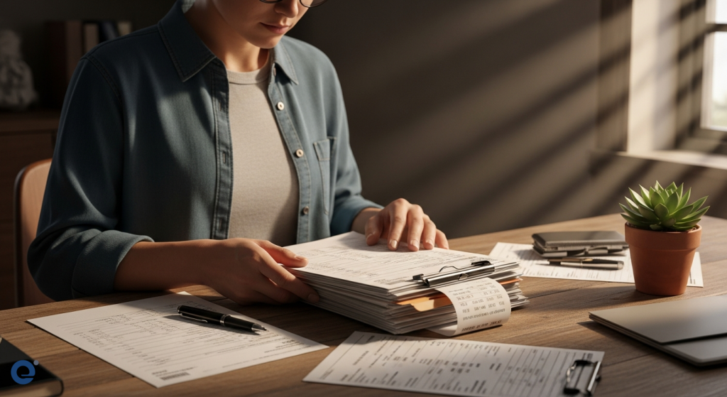 Một người đang cẩn thận sắp xếp các giấy tờ quan trọng như bảng lương và biên lai thuế trên bàn làm việc.