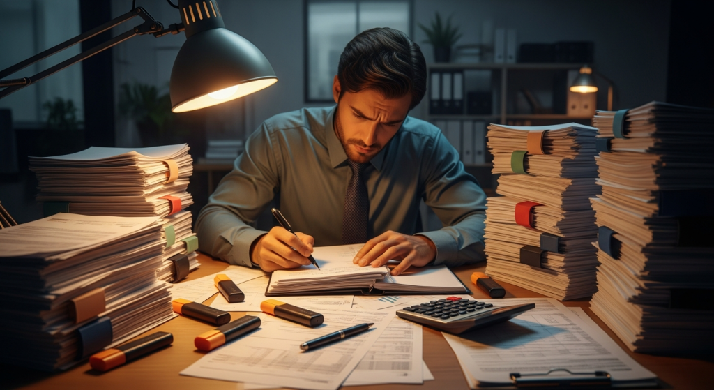 Một kế toán viên cẩn thận xem xét các hóa đơn và chứng từ dưới ánh đèn bàn, chuẩn bị cho một cuộc kiểm tra thuế sắp tới.