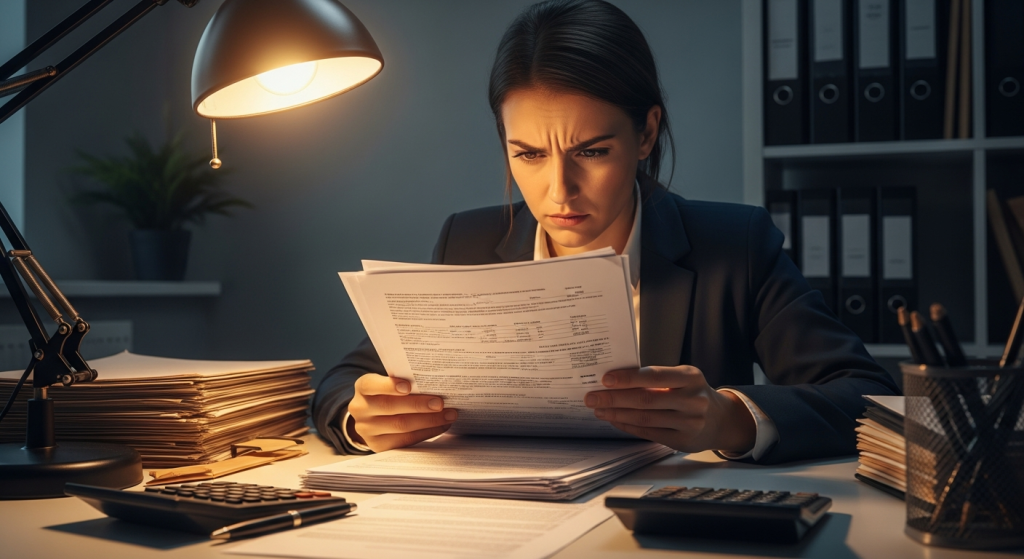 Một kế toán viên cẩn thận xem xét các giấy tờ phức tạp, chuẩn bị hồ sơ xin miễn giảm thuế theo quy định.
