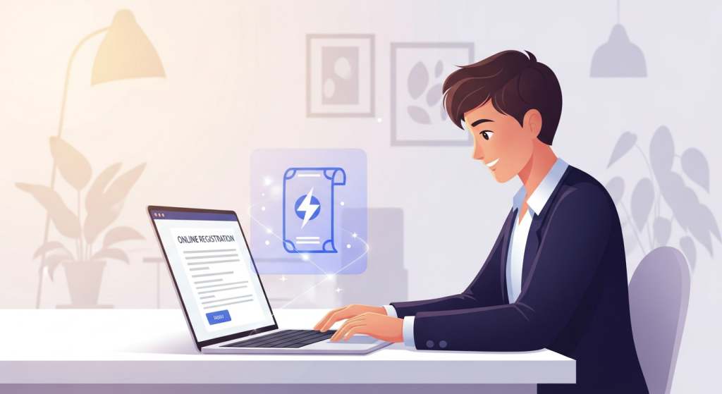 Hình ảnh minh họa một doanh nhân trẻ đang làm thủ tục đăng ký kinh doanh trực tuyến trên máy tính, với biểu tượng hóa đơn điện tử nổi bật.