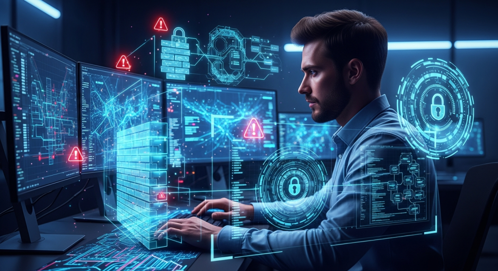 Hình ảnh minh họa: Một chuyên gia an ninh mạng đang phân tích dữ liệu trên màn hình, xung quanh là các cảnh báo về mối đe dọa.