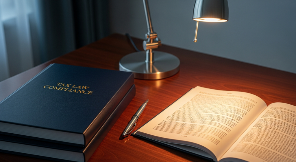 Hình ảnh minh họa một văn bản pháp lý về thuế được đặt trên bàn làm việc, với ánh sáng dịu nhẹ chiếu vào, gợi lên sự nghiêm túc và cần thiết của việc tuân thủ luật pháp.