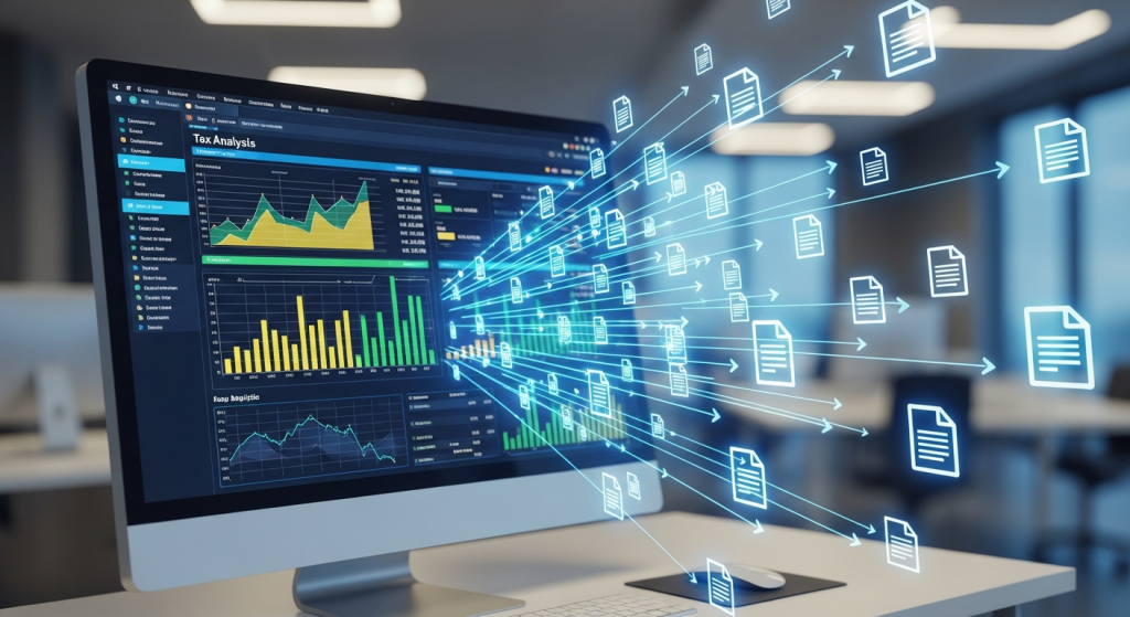 Hình ảnh minh họa: Một màn hình máy tính hiển thị biểu đồ dữ liệu thuế, với các mũi tên chỉ dẫn kết nối đến các tệp tin điện tử, tượng trưng cho quá trình rà soát thuế từ xa.