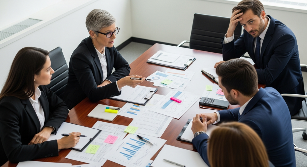 Một cuộc họp căng thẳng giữa các chuyên gia thuế và đại diện doanh nghiệp, thảo luận về các bảng số liệu phức tạp.