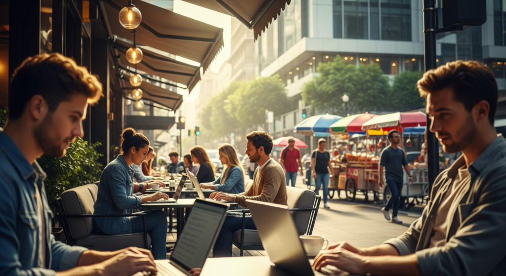 Một nhóm người trẻ làm việc trên laptop tại một quán cà phê ngoài trời, với khung cảnh thành phố nhộn nhịp phía sau, tượng trưng cho lối sống du mục số.