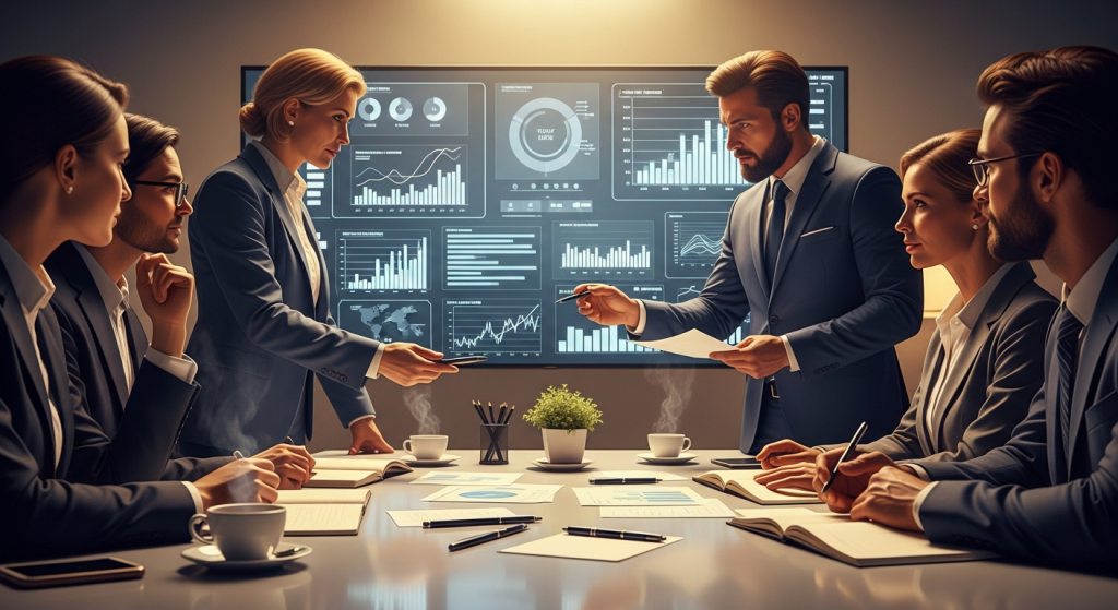 Hình ảnh minh họa các nhà đầu tư đang thảo luận về các biểu đồ tài chính phức tạp, với ánh sáng dịu nhẹ chiếu vào, tạo cảm giác chuyên nghiệp và tập trung.