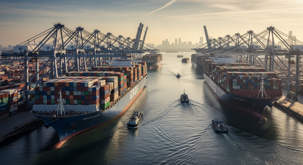 Cảng biển quốc tế sầm uất, nơi hàng hóa được vận chuyển khắp thế giới, minh họa cho sự phức tạp của thương mại toàn cầu và vai trò của các trung tâm tài chính.