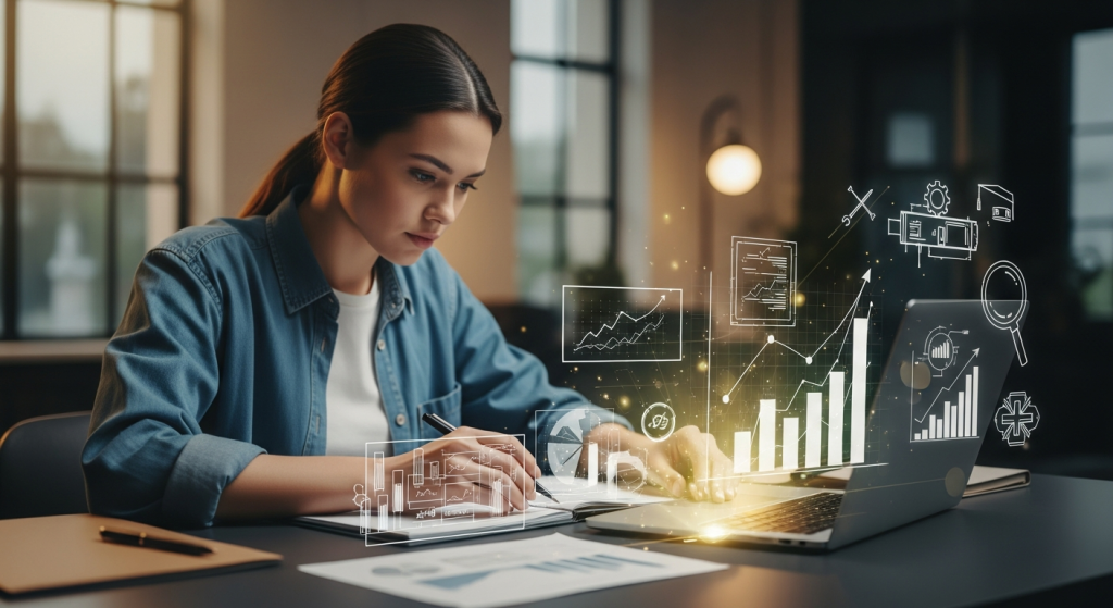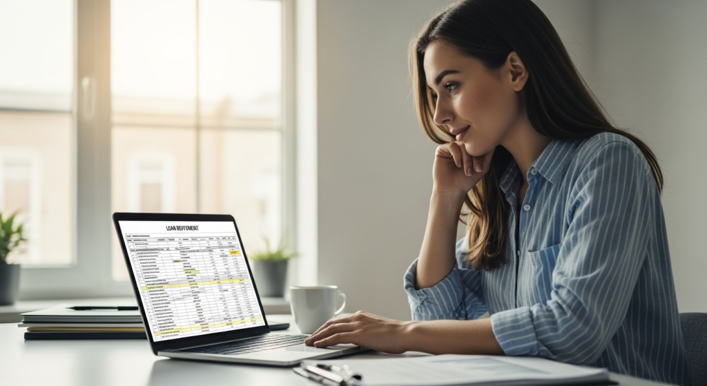 Một sinh viên mới tốt nghiệp đang ngồi tại bàn làm việc, tự tin sử dụng laptop để lập kế hoạch trả nợ vay sinh viên.