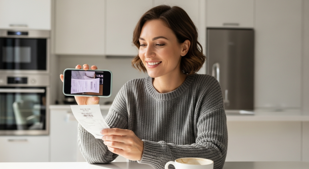 Một người dùng đang mỉm cười, dễ dàng chụp ảnh hóa đơn bằng điện thoại để tải lên ứng dụng thuế.