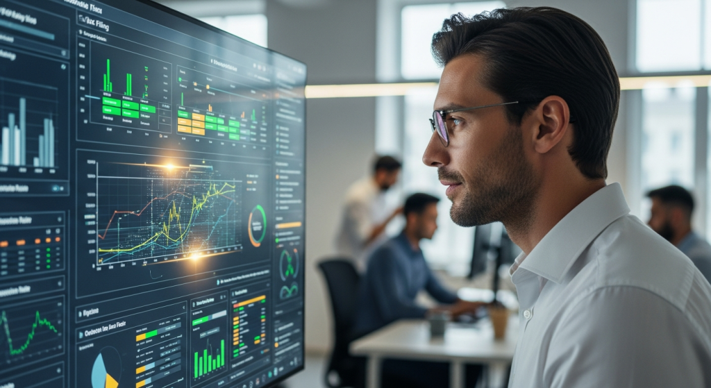 Một chuyên gia vận hành đang giám sát luồng công việc thuế tự động trên màn hình, giúp tiết kiệm thời gian và giảm thiểu sai sót.