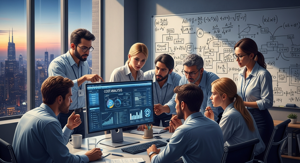 Một nhóm kỹ sư AI đang thảo luận sôi nổi trước màn hình hiển thị biểu đồ phân tích chi phí R&D.
