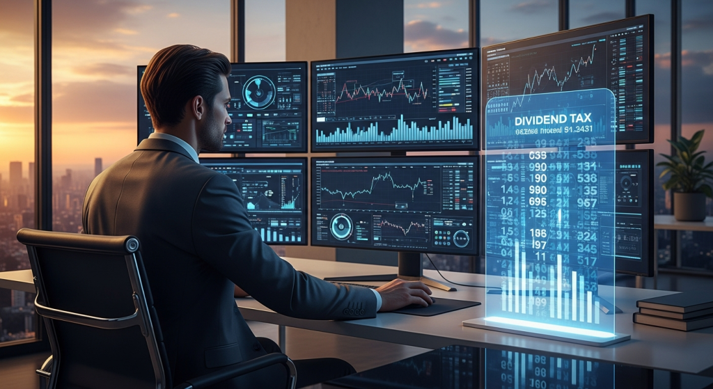 Một nhà quản lý danh mục đang xem xét các biểu đồ phức tạp trên nhiều màn hình, trong khi một giao diện AI hiện đại bên cạnh tự động tính toán thuế cổ tức theo thời gian thực.