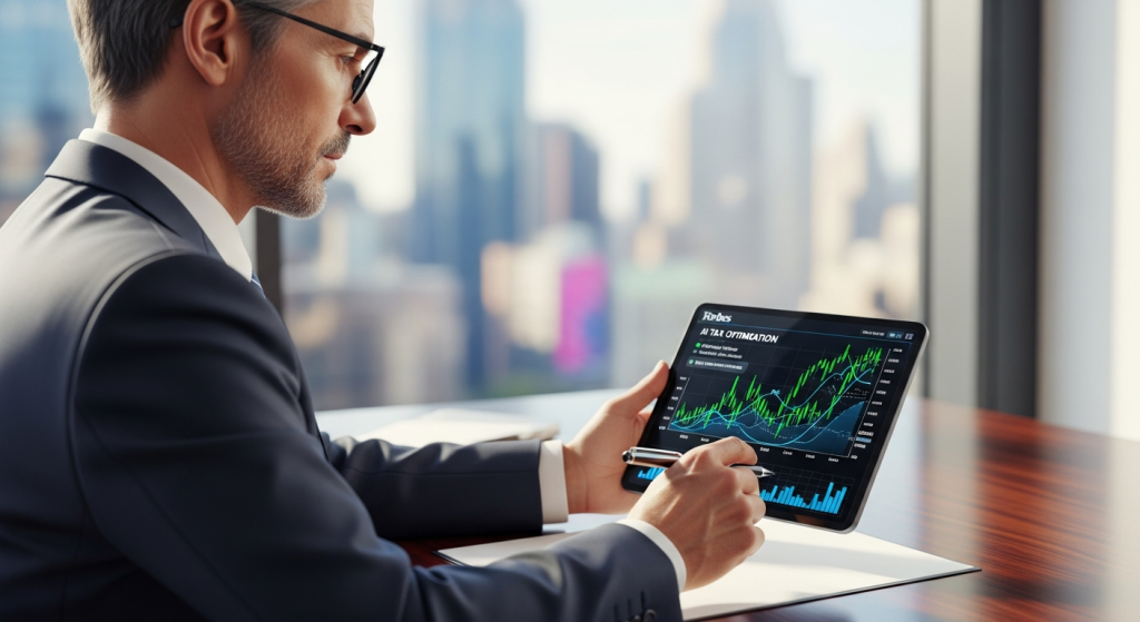Một chuyên gia tài chính đang sử dụng tablet với biểu đồ AI, tối ưu hóa chiến lược thuế cho doanh nghiệp.