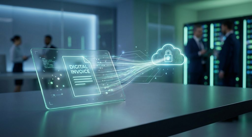 Hình ảnh minh họa một giao diện số hóa hiện đại, hiển thị quy trình xử lý hóa đơn tự động, giảm thiểu tương tác vật lý giữa các bộ phận.