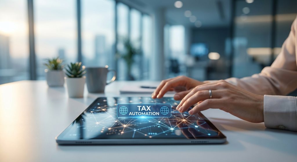 Một chuyên gia quốc tế đang sử dụng phần mềm khai thuế tự động trên máy tính, với các biểu đồ và dữ liệu thuế hiển thị rõ ràng.