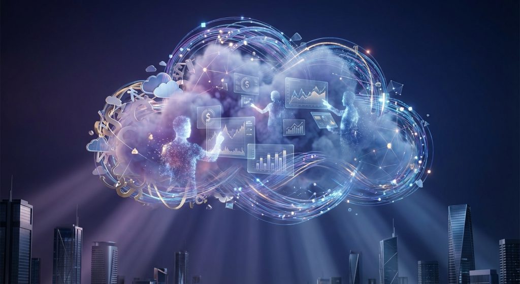 Hình ảnh minh họa đội ngũ tài chính đang cùng nhau làm việc trên một nền tảng đám mây hiện đại.