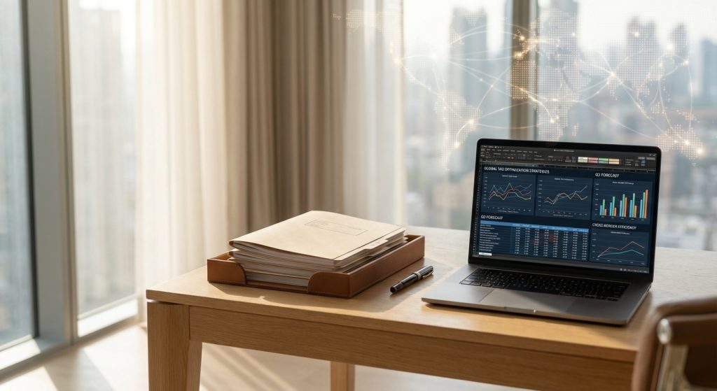 Một lãnh đạo đang làm việc từ xa, cân nhắc giữa các quy định thuế quốc tế phức tạp trên màn hình laptop.