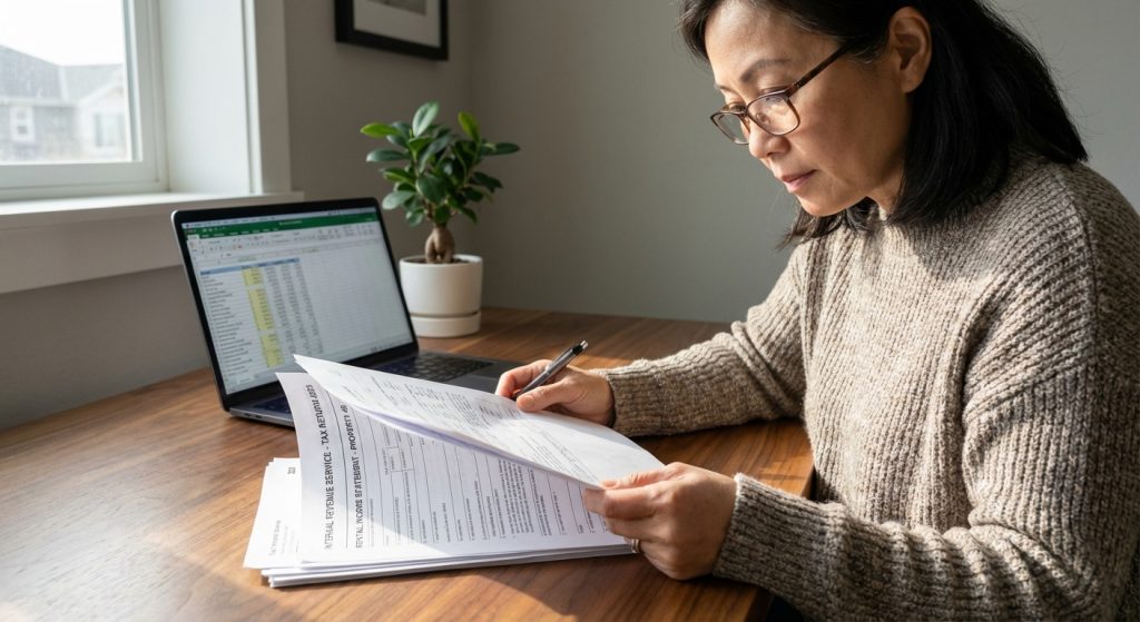 Một chủ nhà đang cẩn thận xem xét các hóa đơn và hợp đồng thuê nhà bên tách trà chiều.