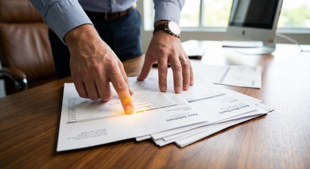 Một solopreneur đang sắp xếp các hóa đơn thẻ tín dụng một cách có tổ chức bên cạnh laptop.