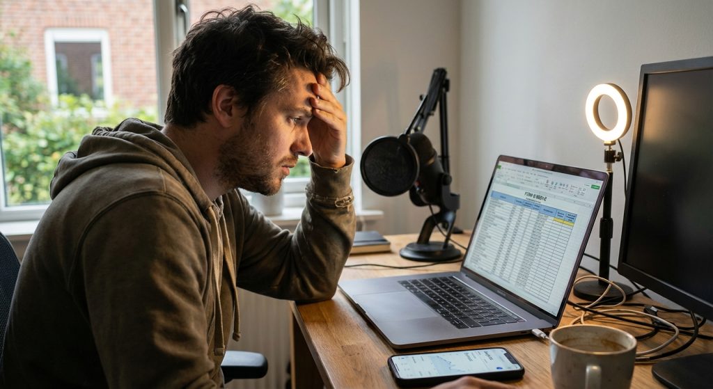 Một nhà sáng tạo nội dung đang xem xét các biểu đồ thu nhập trên laptop, với ánh nắng ban mai chiếu vào phòng làm việc.