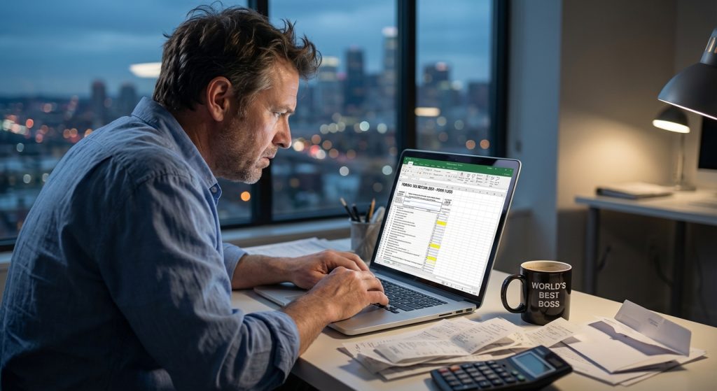 Một Kế toán trưởng đang cẩn thận rà soát từng hóa đơn, chuẩn bị cho kỳ thanh tra thuế sắp tới.