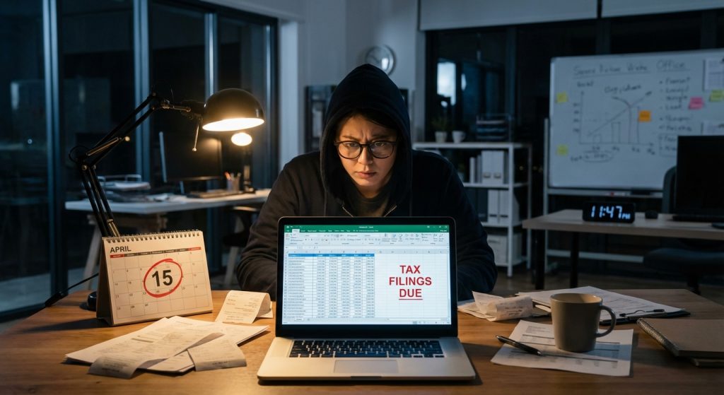 Một kế toán viên đang cẩn thận đánh dấu các hạn nộp thuế quan trọng trên lịch, đảm bảo tuân thủ cho khách hàng startup.