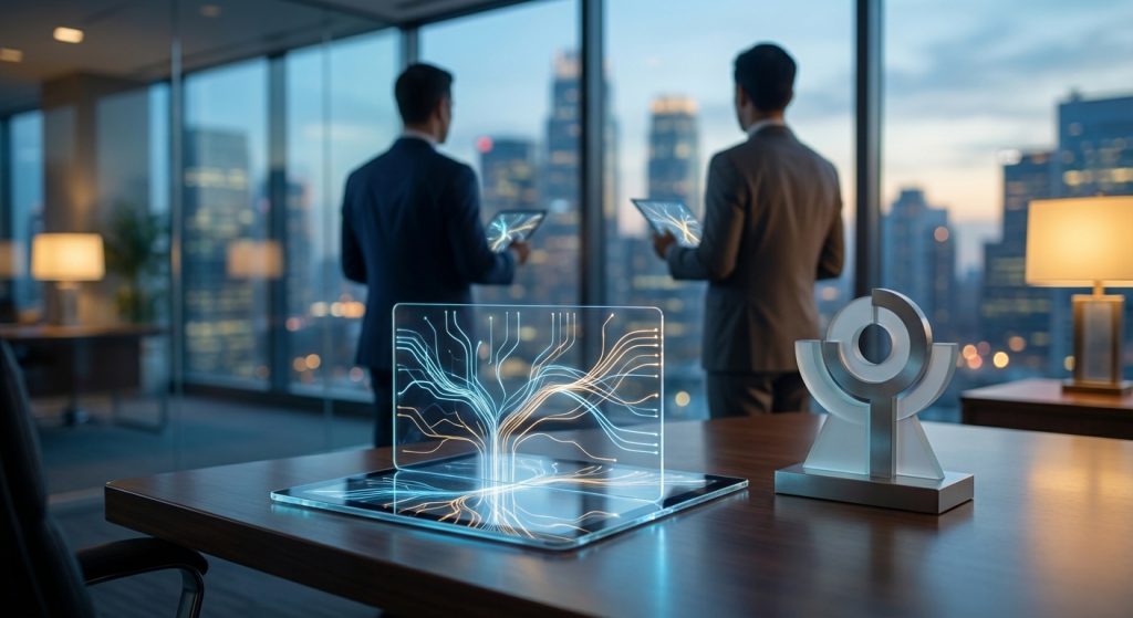 Một CFO đang phân tích sơ đồ dòng tiền quốc tế trên màn hình lớn, thể hiện sự phức tạp của thuế đa quốc gia.